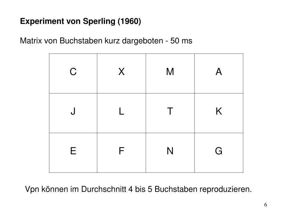 Experiment von Sperling (1960) Matrix von Buchstaben kurz dargeboten - 50 ms Vpn können im Durchschnitt 4 bis 5 Buchstaben reproduzieren.