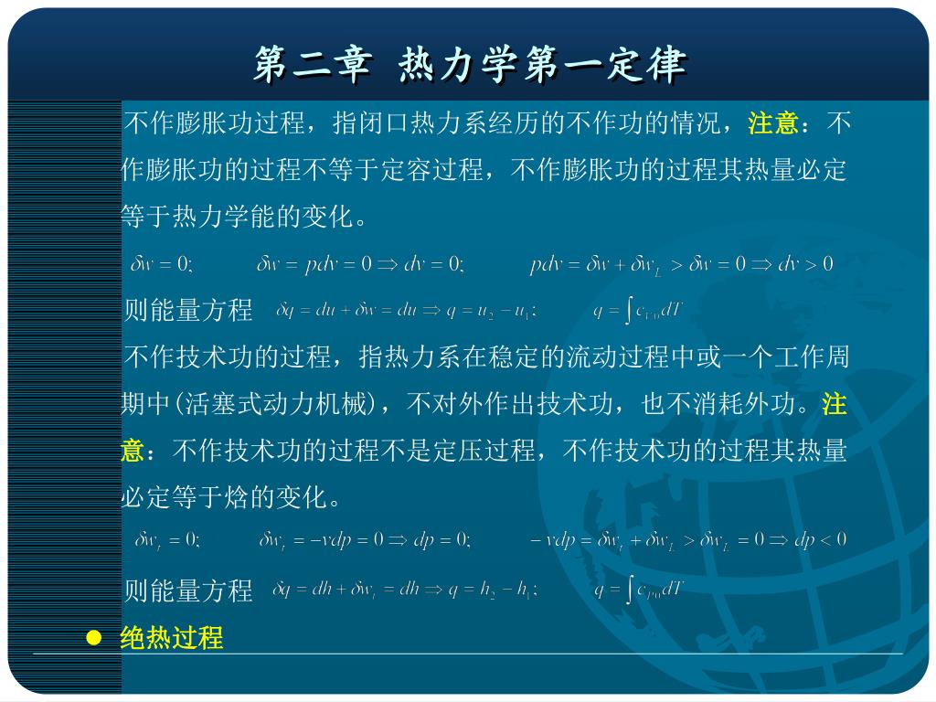 第二章 热力学第一定律 不作膨胀功过程,指闭口热力系经历的不作功的情况,注意:不作膨胀功的过程不等于定容过程,不作膨胀功的过程其热量必定等于热力学能的变化。 则能量方程 不作技术功的过程,指热力系在稳定的流动过程中或一个工作周期中(活塞式动力机械),不对外作出技术功,也不消耗外功。注意:不作技术功的过程不是定压过程,不作技术功的过程其热量必定等于焓的变化。 则能量方程 绝热过程
