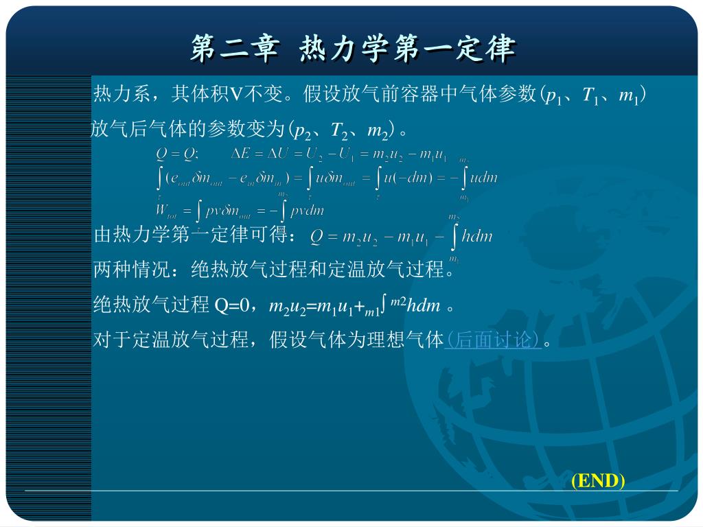 第二章 热力学第一定律 热力系,其体积V不变。假设放气前容器中气体参数(p1、T1、m1) 放气后气体的参数变为(p2、T2、m2)。 由热力学第一定律可得: 两种情况:绝热放气过程和定温放气过程。 绝热放气过程 Q=0,m2u2=m1u1+m1∫ m2hdm。 对于定温放气过程,假设气体为理想气体(后面讨论)。 (END)