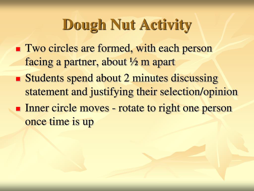 Dough Nut Activity • Two circles are formed, with each person facing a partner, about ½ m apart • Students spend about 2 minutes discussing statement and justifying their selection/opinion • Inner circle moves - rotate to right one person once time is up