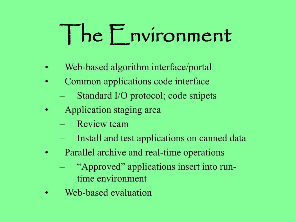 The Environment Web-based algorithm interface/portal Common applications code interface Standard I/O protocol; code snipets Application staging area Review team Install and test applications on canned data Parallel archive and real-time operations “Approved” applications insert into run-time environment Web-based evaluation