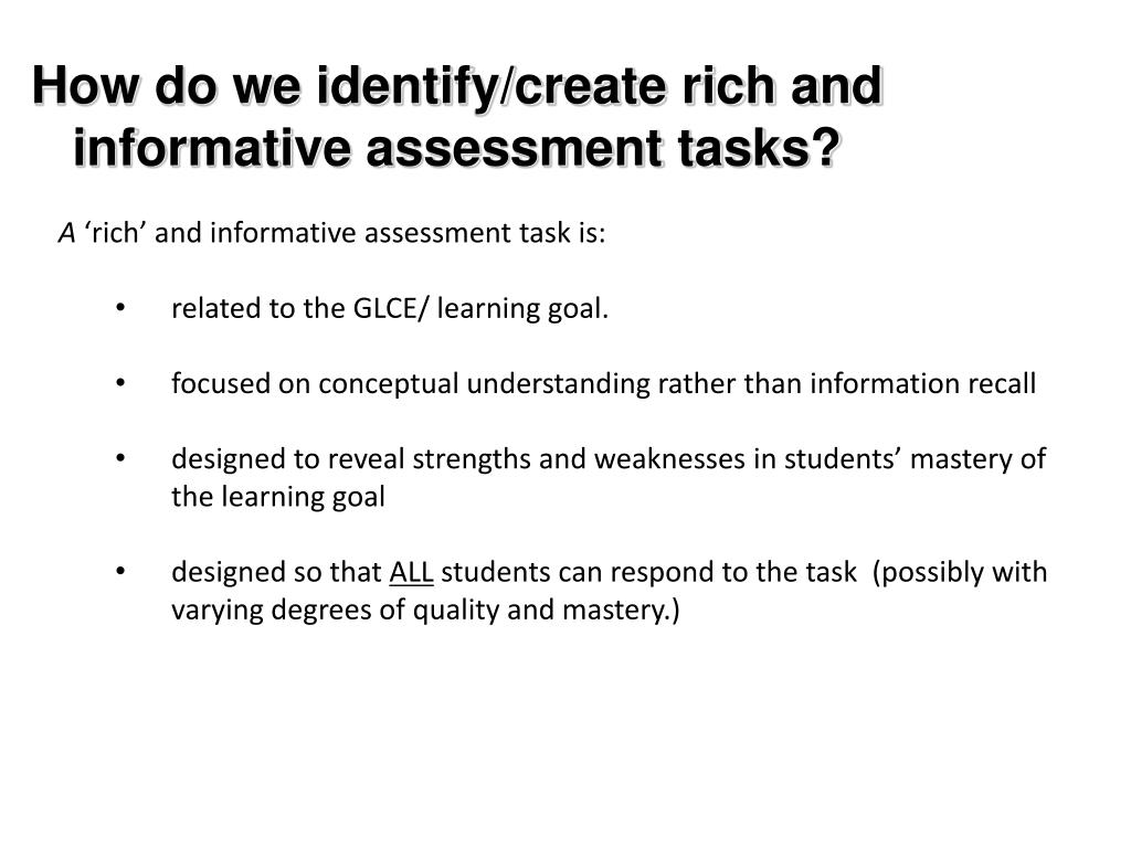 How do we identify/create rich and informative assessment tasks? • A ‘rich’ and informative assessment task is: • related to the GLCE/ learning goal. • focused on conceptual understanding rather than information recall • designed to reveal strengths and weaknesses in students’ mastery of the learning goal • designed so that ALL students can respond to the task (possibly with varying degrees of quality and mastery.)