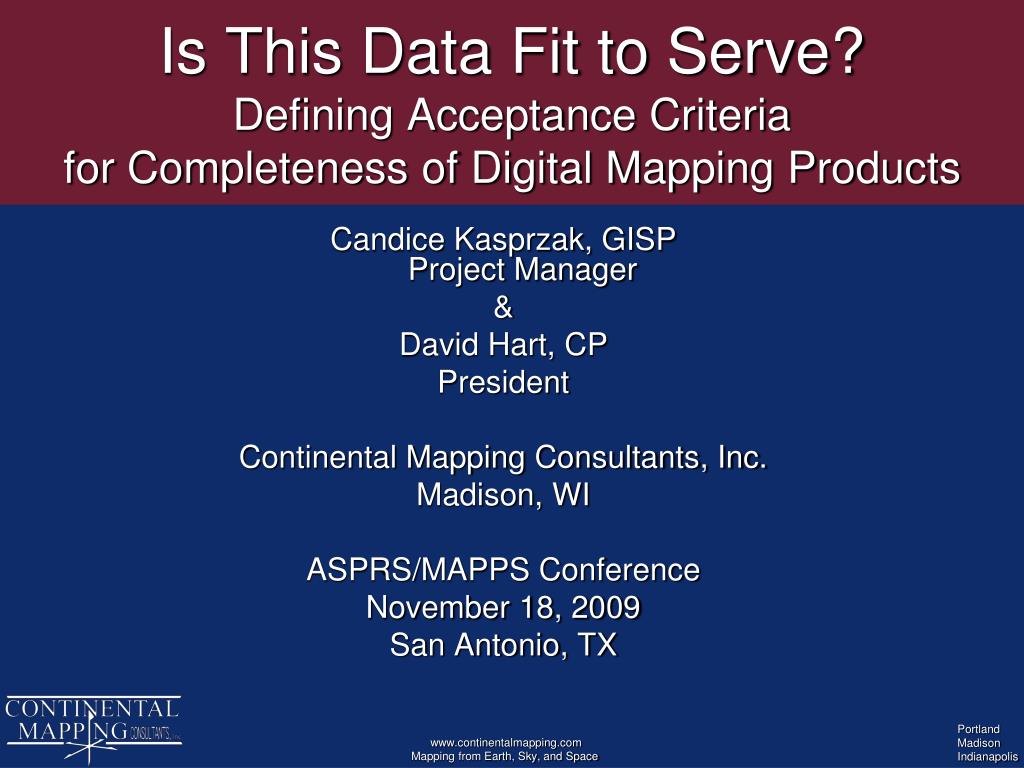Is This Data Fit to Serve? Defining Acceptance Criteria for Completeness of Digital Mapping Products. Candice Kasprzak, GISP Project Manager & David Hart, CP President Continental Mapping Consultants, Inc. Madison, WI ASPRS/MAPPS Conference November 18, 2009 San Antonio, TX.