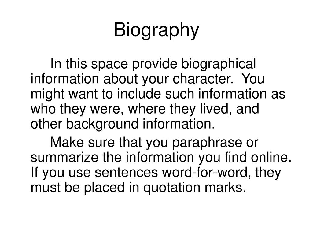 Biography In this space provide biographical information about your character. You might want to include such information as who they were, where they lived, and other background information. Make sure that you paraphrase or summarize the information you find online. If you use sentences word-for-word, they must be placed in quotation marks.