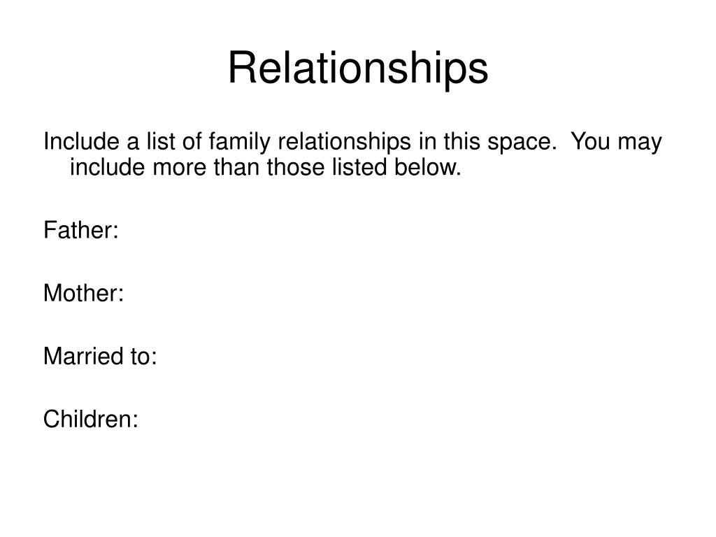 Relationships Include a list of family relationships in this space. You may include more than those listed below. Father: Mother: Married to: Children: