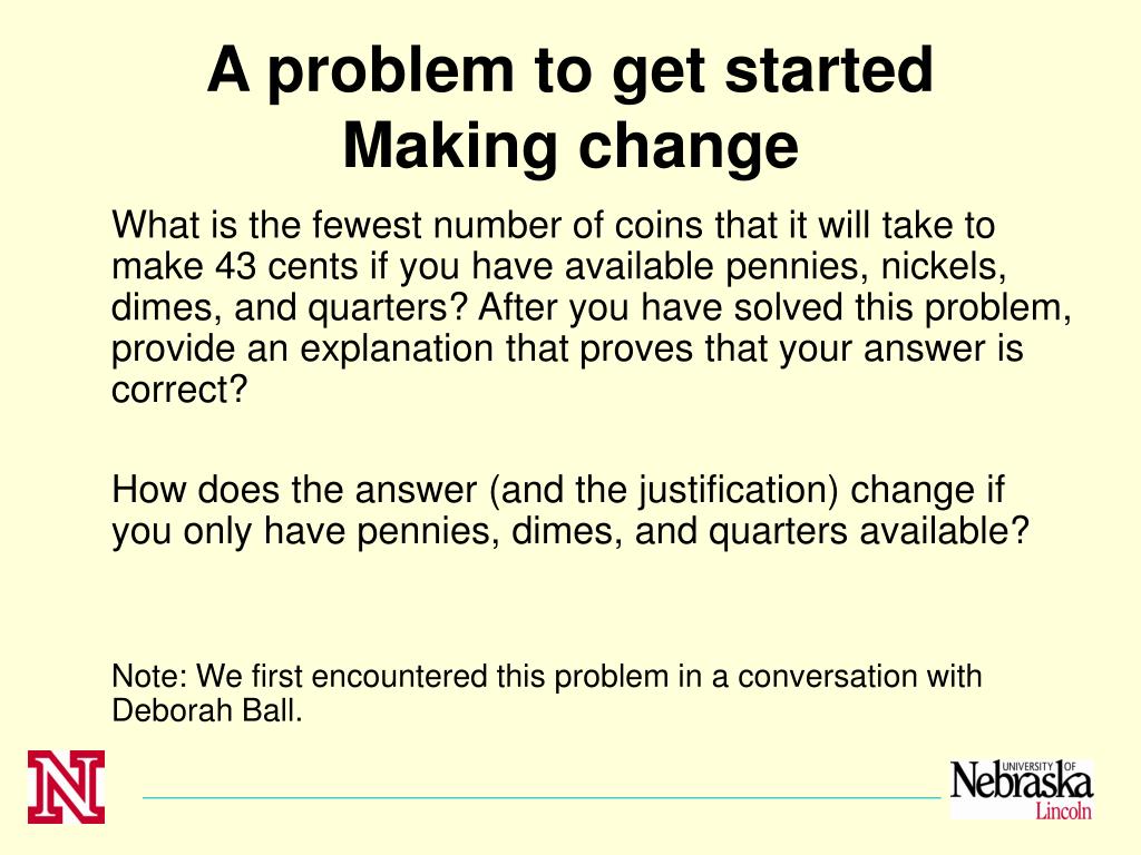A problem to get started Making change What is the fewest number of coins that it will take to make 43 cents if you have available pennies, nickels, dimes, and quarters? After you have solved this problem, provide an explanation that proves that your answer is correct? How does the answer (and the justification) change if you only have pennies, dimes, and quarters available? Note: We first encountered this problem in a conversation with Deborah Ball.