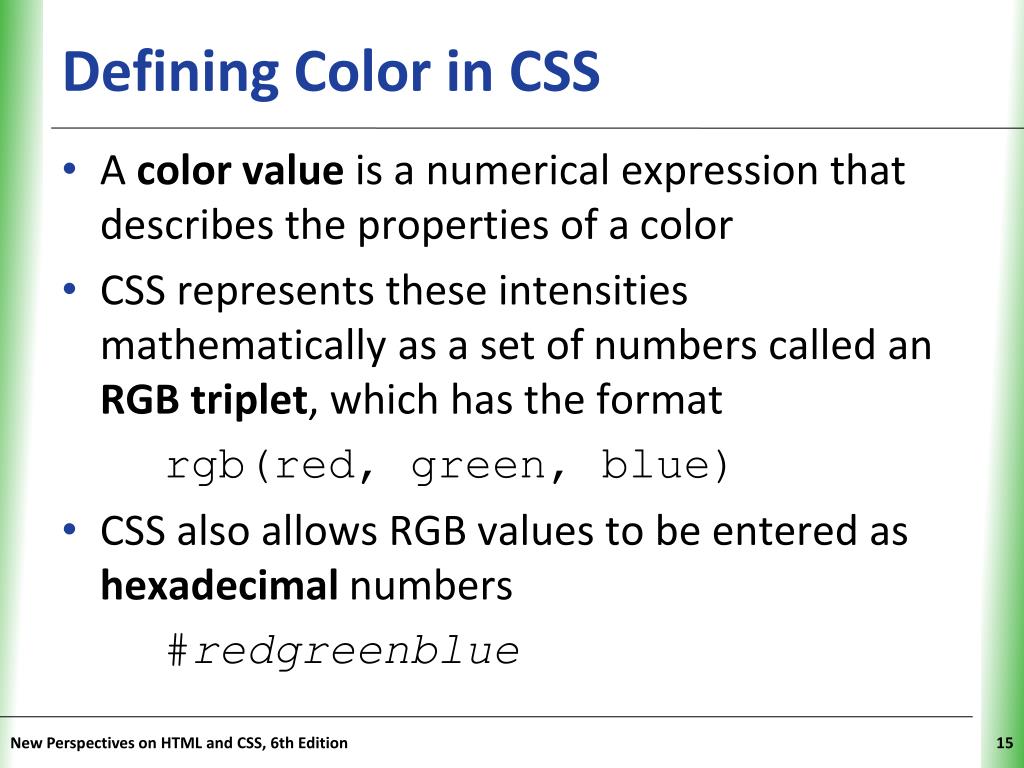 Defining Color in CSS • A color value is a numerical expression that describes the properties of a color • CSS represents these intensities mathematically as a set of numbers called an RGB triplet, which has the format rgb(red, green, blue) • CSS also allows RGB values to be entered as hexadecimalnumbers #redgreenblue New Perspectives on HTML and CSS, 6th Edition