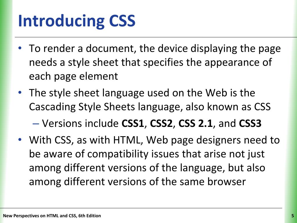 Introducing CSS • To render a document, the device displaying the page needs a style sheet that specifies the appearance of each page element • The style sheet language used on the Web is the Cascading Style Sheets language, also known as CSS • Versions include CSS1, CSS2, CSS 2.1, and CSS3 • With CSS, as with HTML, Web page designers need to be aware of compatibility issues that arise not just among different versions of the language, but also among different versions of the same browser New Perspectives on HTML and CSS, 6th Edition