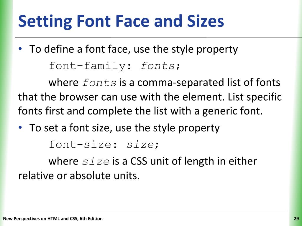 Setting Font Face and Sizes • To define a font face, use the style property font-family: fonts; where fontsis a comma-separated list of fonts that the browser can use with the element. List specific fonts first and complete the list with a generic font. • To set a font size, use the style property font-size: size; where sizeis a CSS unit of length in either relative or absolute units. New Perspectives on HTML and CSS, 6th Edition