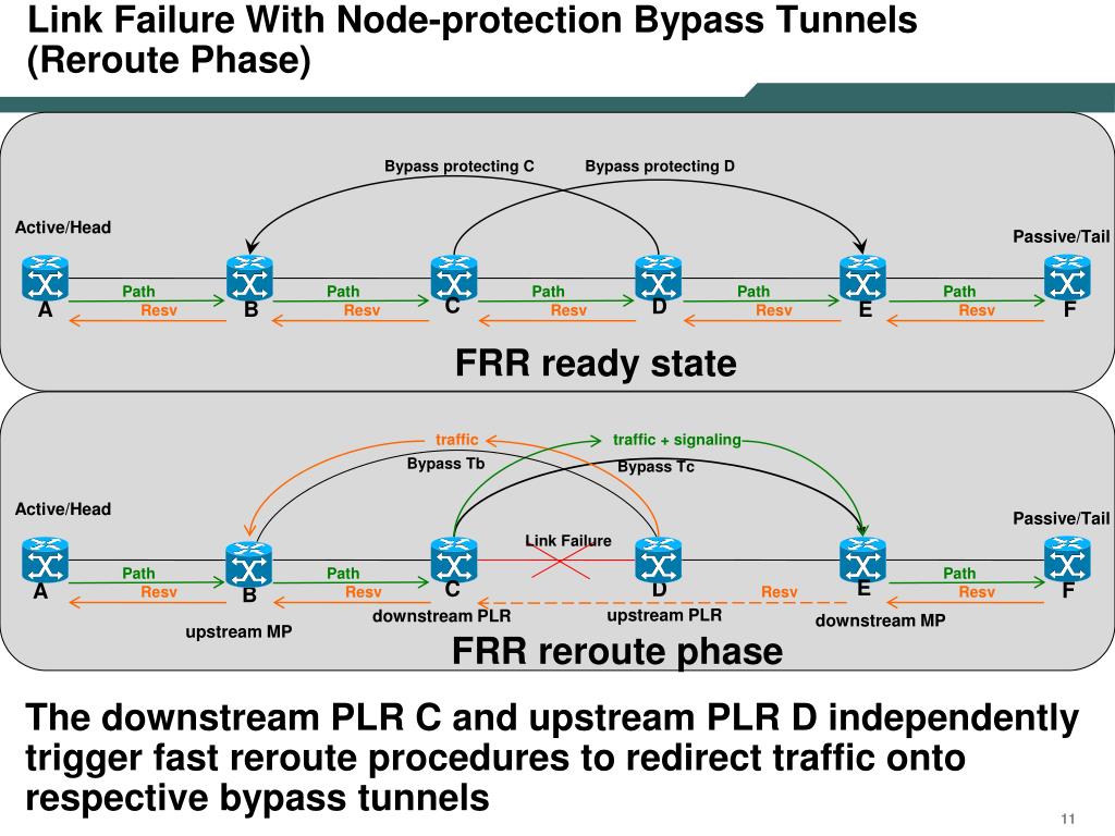 Link Failure With Node-protection Bypass Tunnels(Reroute Phase) Bypass protecting C Bypass protecting D Active/Head Passive/Tail Path Path Path Path Path C D A B E F Resv Resv Resv Resv Resv FRR ready state traffic traffic + signaling Bypass Tb Bypass Tc Active/Head Passive/Tail Link Failure Path Path Path E C D F A B Resv Resv Resv Resv upstream PLR downstream PLR downstream MP upstream MP FRR reroute phase The downstream PLR C and upstream PLR D independently trigger fast reroute procedures to redirect traffic onto respective bypass tunnels