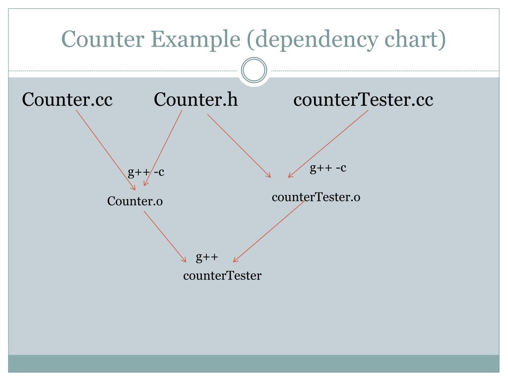 Counter Example (dependency chart) Counter.cc Counter.h counterTester.cc g++ -c g++ -c counterTester.o Counter.o g++ counterTester