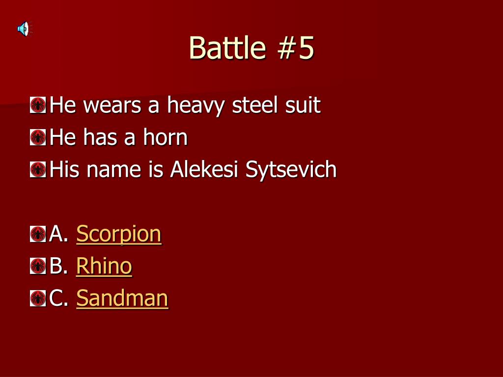 Battle #5 • He wears a heavy steel suit • He has a horn • His name is Alekesi Sytsevich • A. Scorpion • B. Rhino • C. Sandman