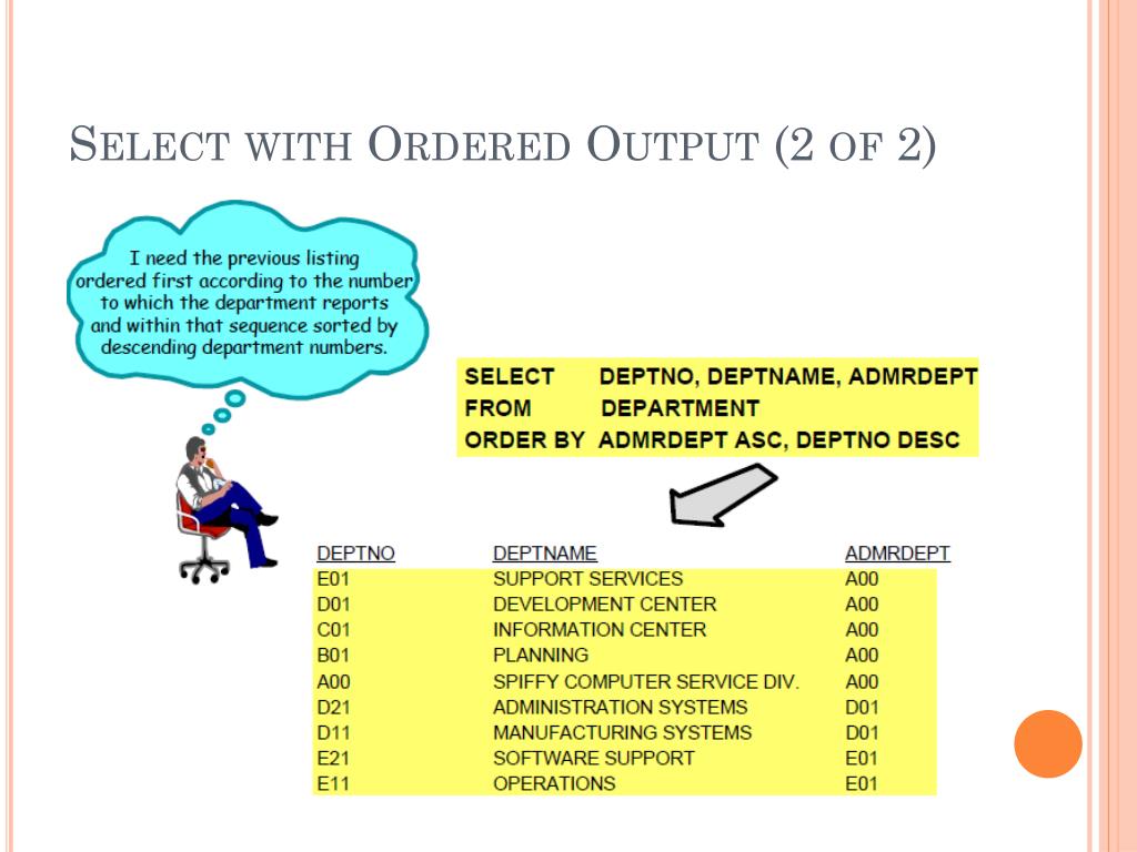 Alternate ORDER BY Specifications • SELECT LASTNAME, FIRSTNME, WORKDEPT, JOB, SEX FROM EMPLOYEE ORDER BY WORKDEPT DESC, JOB, LASTNAME, SEX DESC Equivalent ORDER BY clauses: • ORDER BY WORKDEPT DESC, JOB ASC, LASTNAME ASC, SEX DESC • ORDER BY 3 DESC, 4, 1, 5 DESC • ORDER BY 3 DESC, 4 ASC, 1 ASC, 5 DESC • ORDER BY 3 DESC, JOB, LASTNAME, 5 DESC • ORDER BY WORKDEPT DESC, 4 ASC, 1 ASC, SEX DESC