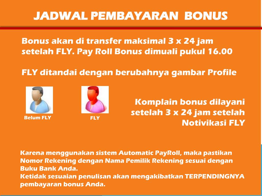 JADWAL PEMBAYARAN BONUS Bonus akan di transfer maksimal 3 x 24 jam setelah FLY. Pay Roll Bonus dimualipukul 16.00 FLY ditandaidenganberubahnyagambar Profile Komplain bonus dilayanisetelah 3 x 24 jam setelahNotivikasi FLY Belum FLY FLY Karenamenggunakansistem Automatic PayRoll, makapastikanNomorRekeningdenganNamaPemilikRekeningsesuaidenganBuku Bank Anda. Ketidaksesuaianpenulisanakanmengakibatkan TERPENDINGNYA pembayaran bonus Anda.