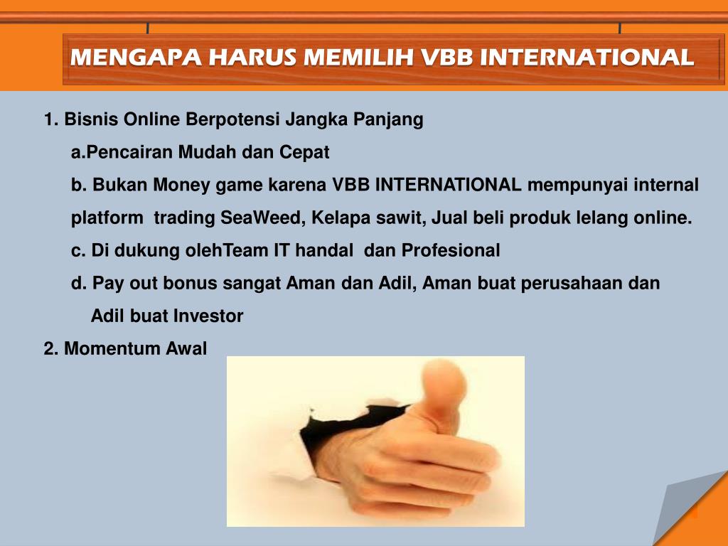 MENGAPA HARUS MEMILIH VBB INTERNATIONAL • 1. Bisnis Online BerpotensiJangkaPanjang • a.PencairanMudahdanCepat • b. Bukan Money game karenaVBB INTERNATIONALmempunyai internal platform trading SeaWeed, Kelapa sawit, Jual beli produk lelang online. • c. Di dukungolehTeam IT handaldanProfesional • d. Pay out bonus sangatAmandanAdil, Amanbuatperusahaandan • Adilbuat Investor • 2. Momentum Awal
