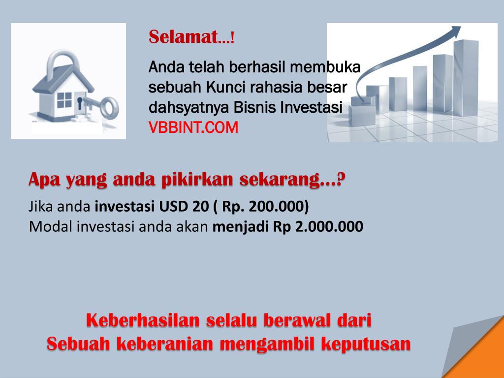Selamat…! Andatelahberhasilmembuka sebuahKuncirahasiabesar dahsyatnyaBisnis Investasi VBBINT.COM Apa yang andapikirkansekarang…? JikaandainvestasiUSD 20 ( Rp. 200.000) Modal investasiandaakanmenjadiRp 2.000.000 Keberhasilanselaluberawaldari Sebuah keberanianmengambilkeputusan