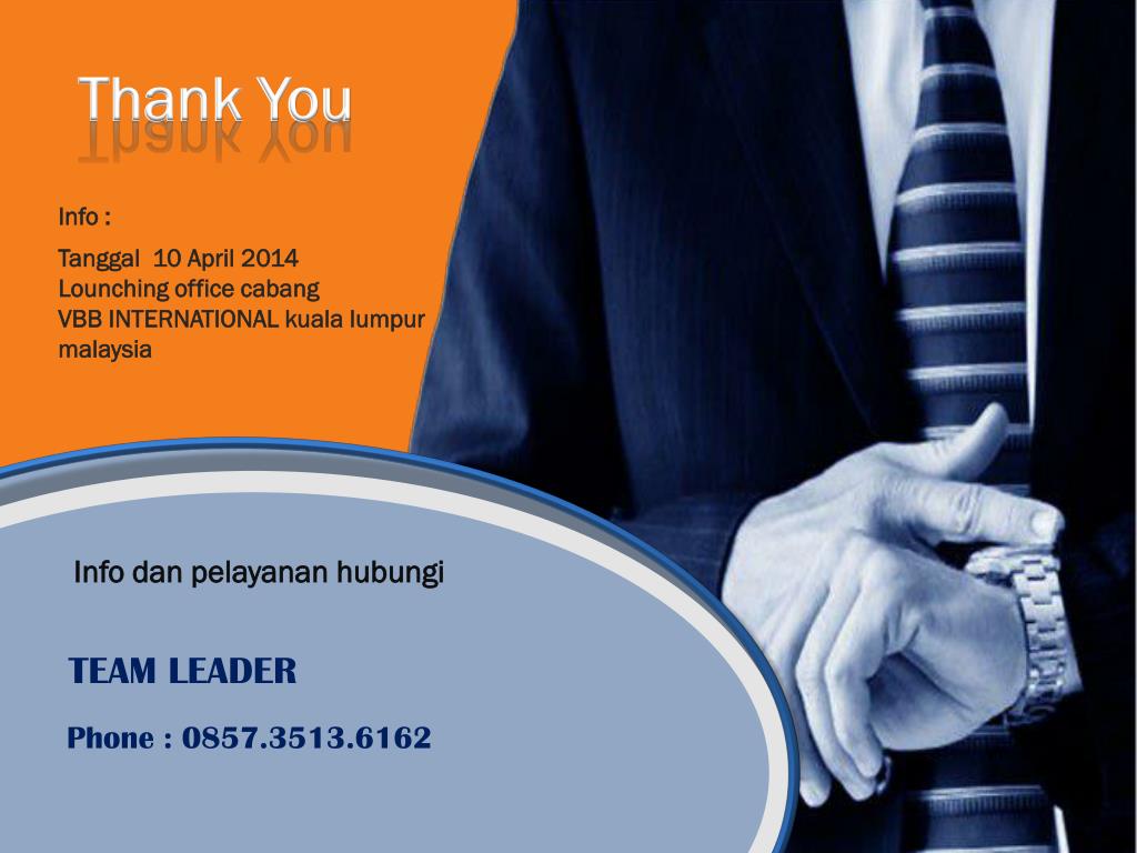 Thank You Info : Tanggal 10 April2014 Lounching office cabang VBB INTERNATIONAL kuala lumpur malaysia Info danpelayananhubungi TEAM LEADER Phone : 0857.3513.6162