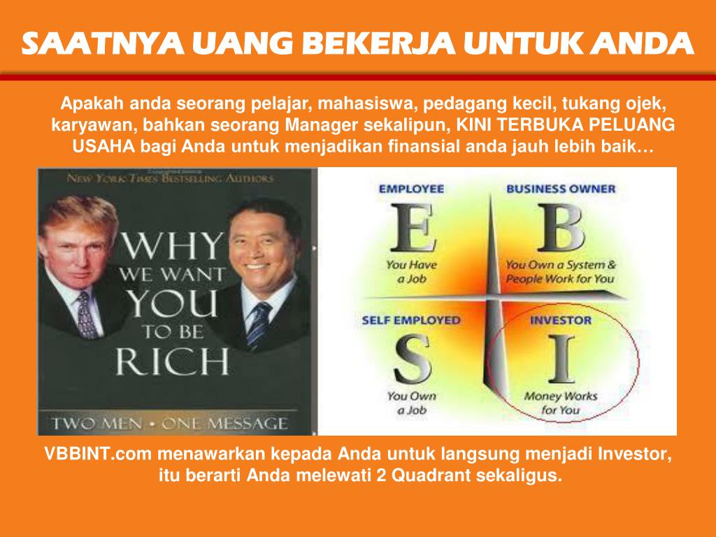 SAATNYA UANG BEKERJA UNTUK ANDA Apakah anda seorang pelajar, mahasiswa, pedagang kecil, tukang ojek, karyawan, bahkan seorang Manager sekalipun, KINI TERBUKA PELUANG USAHA bagi Anda untuk menjadikan finansial anda jauh lebih baik… VBBINT.commenawarkankepadaAndauntuklangsungmenjadi Investor, ituberartiAndamelewati 2 Quadrant sekaligus.