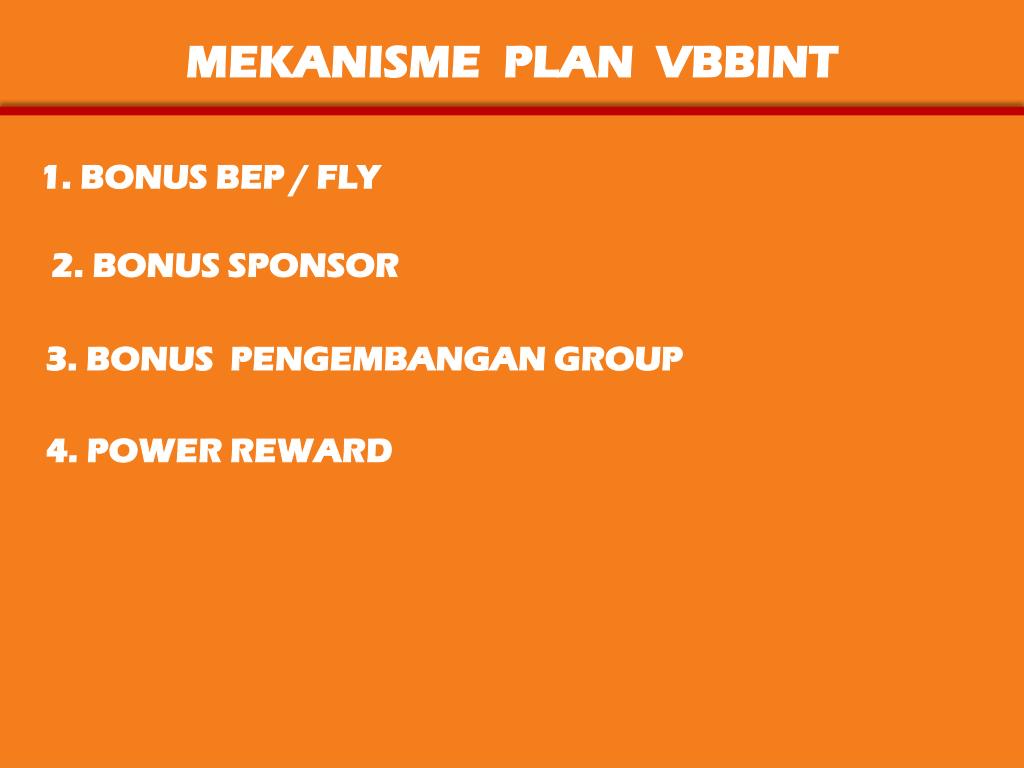 MEKANISME PLAN VBBINT 1. BONUS BEP / FLY 2. BONUS SPONSOR 3. BONUS PENGEMBANGAN GROUP 4. POWER REWARD