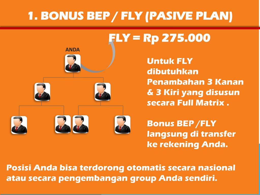 1. BONUS BEP / FLY (PASIVE PLAN) FLY = Rp 275.000 ANDA Untuk FLY dibutuhkanPenambahan 3 Kanan & 3 Kiri yang disusunsecara Full Matrix . Bonus BEP /FLY langsung di transfer kerekeningAnda. PosisiAndabisaterdorongotomatissecaranasionalatausecarapengembangan group Andasendiri.