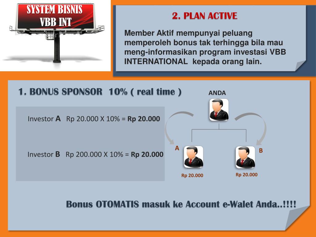 SYSTEM BISNIS VSW LTD SYSTEM BISNIS VBB INT 2. PLAN ACTIVE Member Aktifmempunyaipeluangmemperoleh bonus takterhinggabilamaumeng-informasikan program investasiVBB INTERNATIONAL kepada orang lain. ANDA 1. BONUS SPONSOR 10% ( real time ) A Investor ARp 20.000 X 10% = Rp 20.000 B Investor BRp 200.000 X 10% = Rp 20.000 Rp 20.000 Rp 20.000 Bonus OTOMATIS masukke Account e-WaletAnda..!!!!