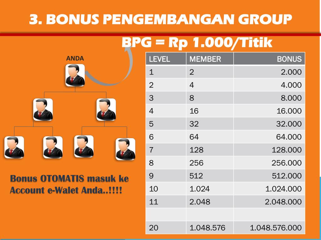 3. BONUS PENGEMBANGAN GROUP BPG = Rp 1.000/Titik ANDA Bonus OTOMATIS masukke Account e-WaletAnda..!!!!