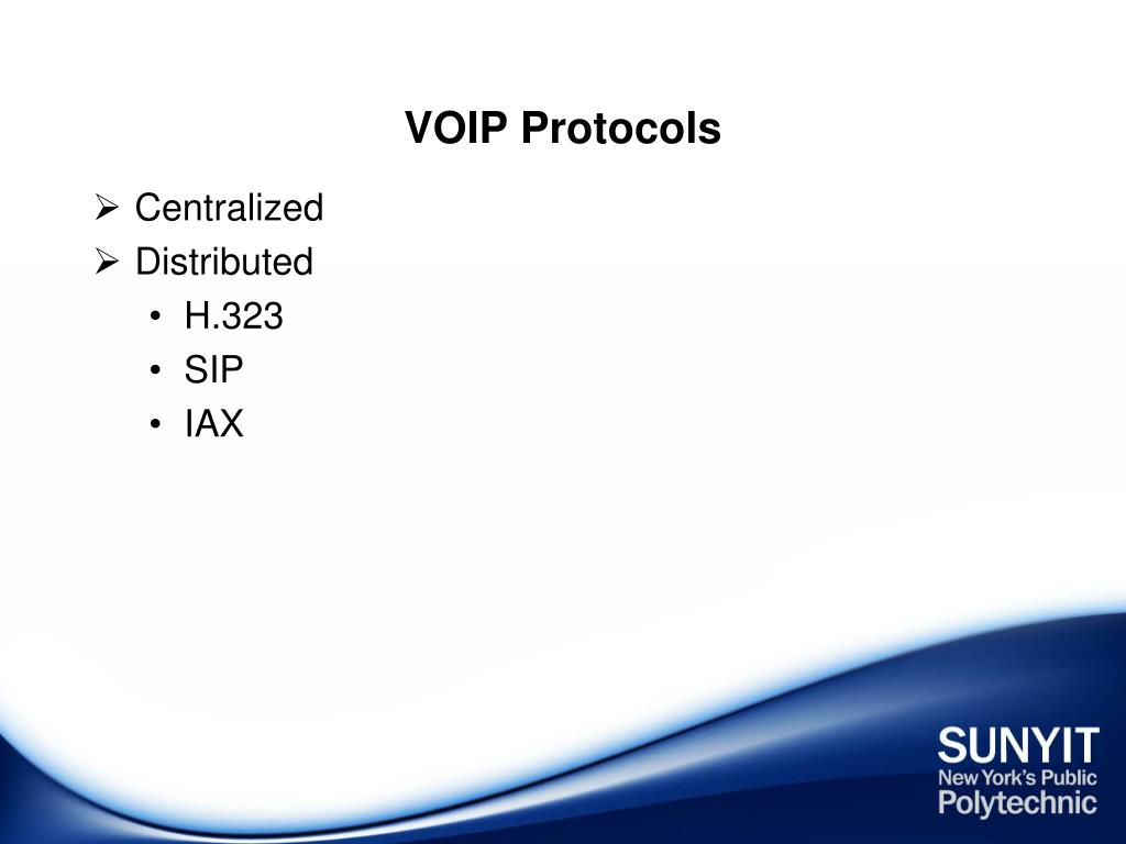 VOIP Protocols • Centralized • Distributed • H.323 • SIP • IAX