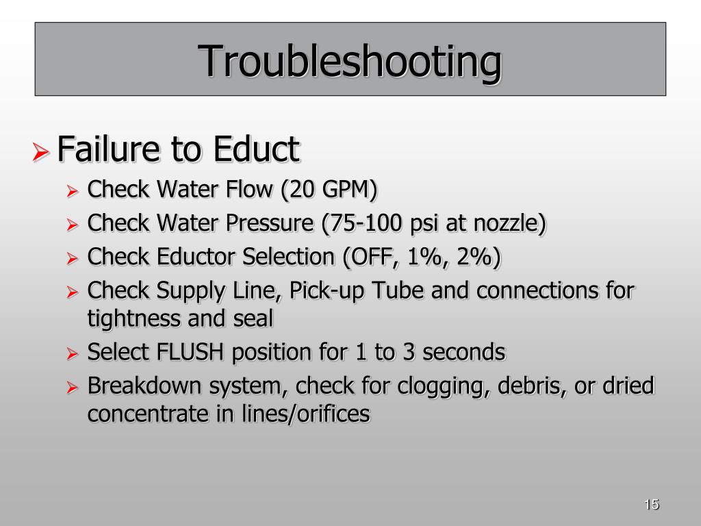 Troubleshooting • Failure to Educt • Check Water Flow (20 GPM) • Check Water Pressure (75-100 psi at nozzle) • Check Eductor Selection (OFF, 1%, 2%) • Check Supply Line, Pick-up Tube and connections for tightness and seal • Select FLUSH position for 1 to 3 seconds • Breakdown system, check for clogging, debris, or dried concentrate in lines/orifices