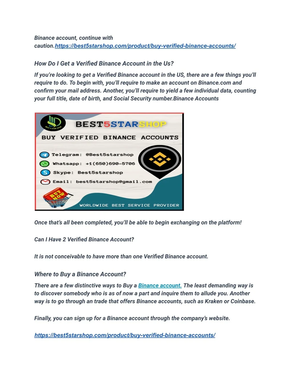 Whatsapp: +1(650)690-5706 Email: best5starshop@gmail.com Secondly, since Binance is so well known, there are moreover a part of tricks out there. So, how can you maintain a strategic distance from getting scammed when buying a Binance account? Here are a few tips: – As it were Buy from legitimate venders. There are numerous tricks out there, so be beyond any doubt to do your inquire about some time recently buying. – Make beyond any doubt the account comes with all the essential documentation.https://best5starshop.com/product/buy-verified-binance-accounts/ This incorporates the username and watchword, as well as any 2FA codes or other security measures that may be in put. – Inquire questions! If something doesn’t show up right, it likely isn’t.. Trust your intestine and don’t be anxious to inquire questions some time recently making a Buy. https://best5starshop.com/product/buy-verified-binance-accounts/ If you want to know more or any query, just knock us here– 24 Hours Reply/ (Contact Us) Skype: Best5starshop Telegram: @Best5starshop