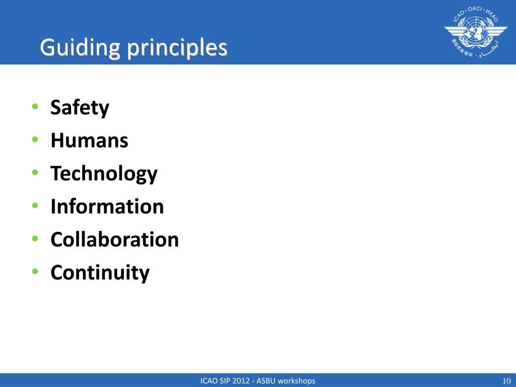 Guiding principles • Safety • Humans • Technology • Information • Collaboration • Continuity ICAO SIP 2012 - ASBU workshops