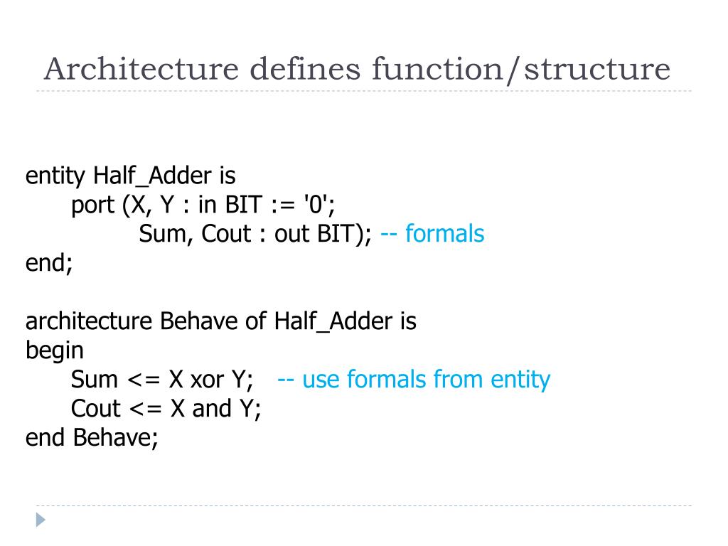 Architecture defines function/structure entity Half_Adder is port (X, Y : in BIT := '0'; Sum, Cout : out BIT); -- formals end; architecture Behave of Half_Adder is begin Sum <= X xor Y; -- use formals from entity Cout <= X and Y; end Behave;