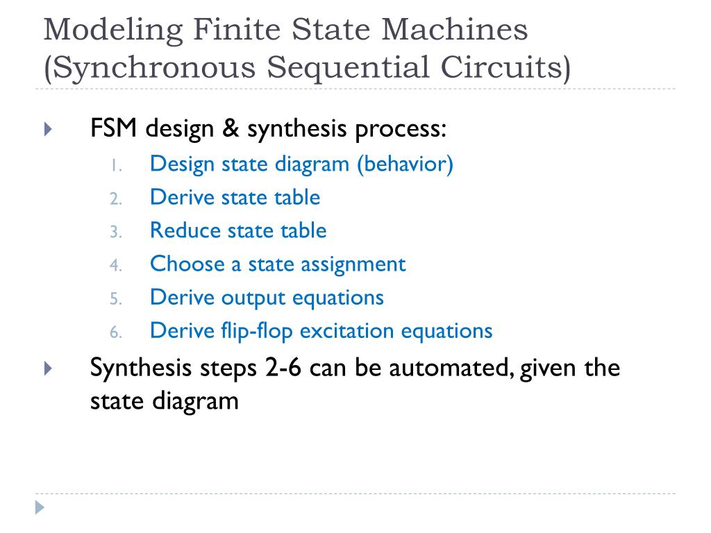 Modeling Finite State Machines (Synchronous Sequential Circuits) • FSM design & synthesis process: • Design state diagram (behavior) • Derive state table • Reduce state table • Choose a state assignment • Derive output equations • Derive flip-flop excitation equations • Synthesis steps 2-6 can be automated, given the state diagram