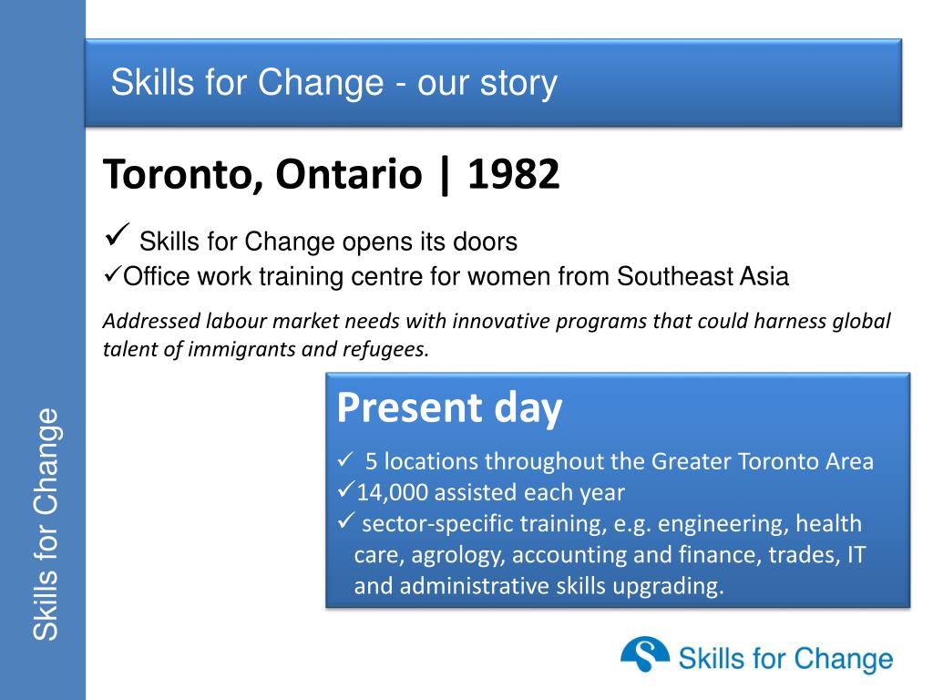 Skills for Change - our story • Toronto, Ontario | 1982 • Skills for Change opens its doors • Office work training centre for women from Southeast Asia • Addressed labour market needs with innovative programs that could harness global talent of immigrants and refugees. • Present day • 5 locations throughout the Greater Toronto Area • 14,000 assisted each year • sector-specific training, e.g. engineering, health care, agrology, accounting and finance, trades, IT and administrative skills upgrading. Skills for Change