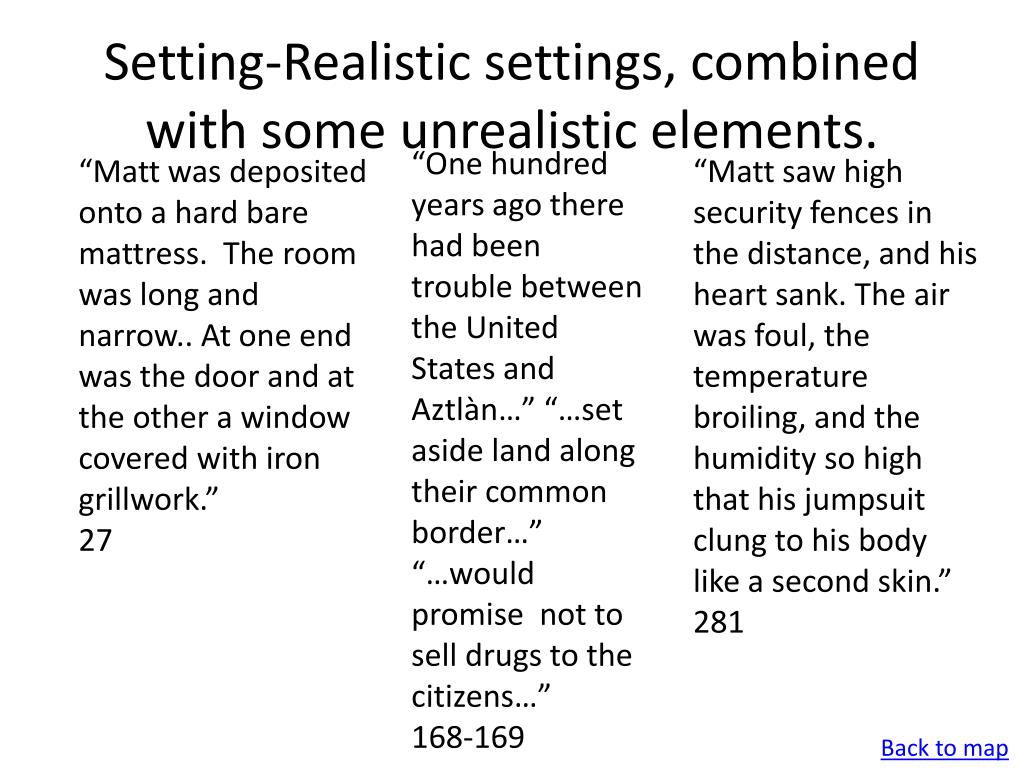 Setting-Realistic settings, combined with some unrealistic elements. “One hundred years ago there had been trouble between the United States and Aztlàn…” “…set aside land along their common border…” “…would promise not to sell drugs to the citizens…” 168-169 “Matt was deposited onto a hard bare mattress. The room was long and narrow.. At one end was the door and at the other a window covered with iron grillwork.” 27 “Matt saw high security fences in the distance, and his heart sank. The air was foul, the temperature broiling, and the humidity so high that his jumpsuit clung to his body like a second skin.” 281 Back to map