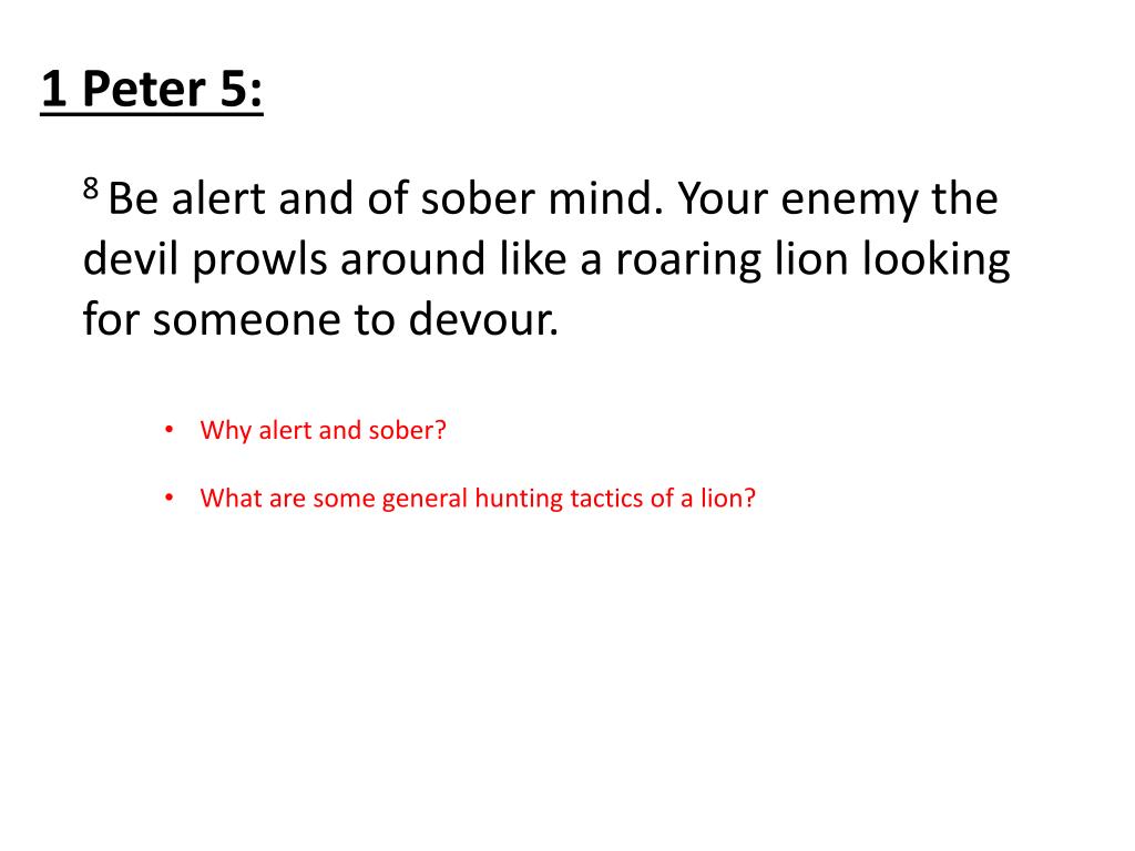 1 Peter 5: 8 Be alert and of sober mind. Your enemy the devil prowls around like a roaring lion looking for someone to devour. • Why alert and sober? • What are some general hunting tactics of a lion?