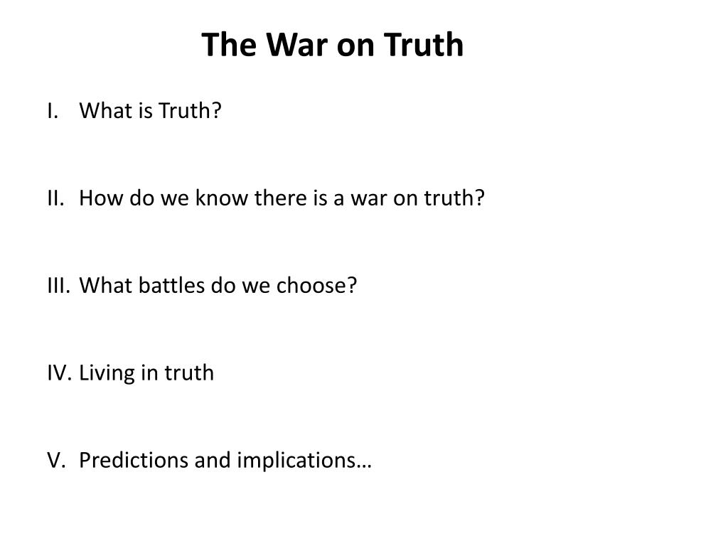 The War on Truth What is Truth? How do we know there is a war on truth? What battles do we choose? Living in truth Predictions and implications…