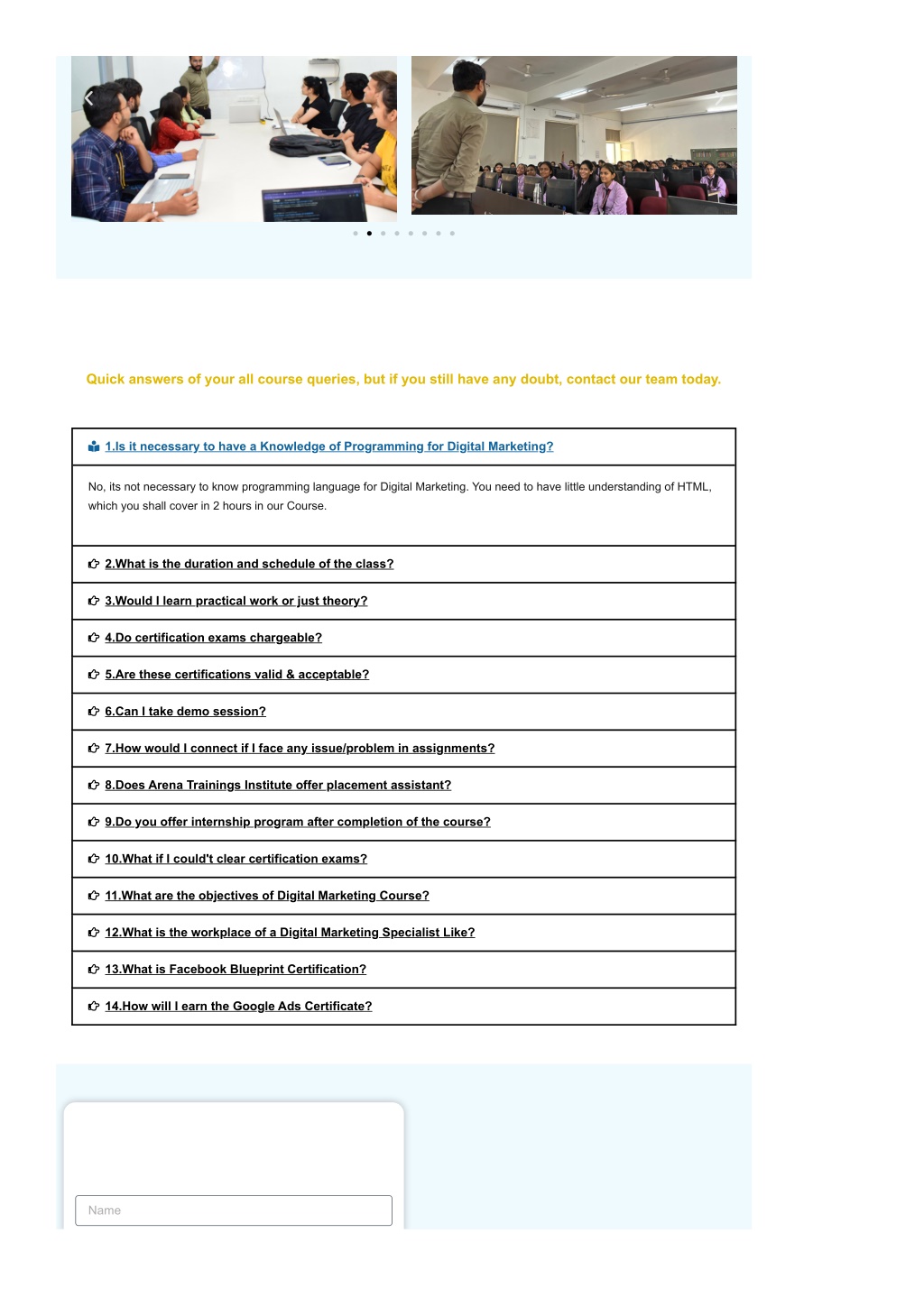 Quick answers of your all course queries, but if you still have any doubt, contact our team today. 1.Is it necessary to have a Knowledge of Programming for Digital Marketing? No, its not necessary to know programming language for Digital Marketing. You need to have little understanding of HTML, which you shall cover in 2 hours in our Course. 2.What is the duration and schedule of the class? 3.Would I learn practical work or just theory? 4.Do certification exams chargeable? 5.Are these certifications valid & acceptable? 6.Can I take demo session? 7.How would I connect if I face any issue/problem in assignments? 8.Does Arena Trainings Institute offer placement assistant? 9.Do you offer internship program after completion of the course? 10.What if I could't clear certification exams? 11.What are the objectives of Digital Marketing Course? 12.What is the workplace of a Digital Marketing Specialist Like? 13.What is Facebook Blueprint Certification? 14.How will I earn the Google Ads Certificate? Name