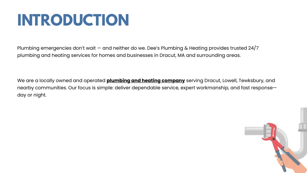 INTRODUCTION Plumbing emergencies don’t wait — and neither do we. Dee’s Plumbing & Heating provides trusted 24/7 plumbing and heating services for homes and businesses in Dracut, MA and surrounding areas. We are a locally owned and operated plumbing and heating company serving Dracut, Lowell, Tewksbury, and nearby communities. Our focus is simple: deliver dependable service, expert workmanship, and fast response— day or night.