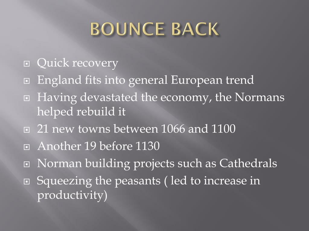 BOUNCE BACK • Quick recovery • England fits into general European trend • Having devastated the economy, the Normans helped rebuild it • 21 new towns between 1066 and 1100 • Another 19 before 1130 • Norman building projects such as Cathedrals • Squeezing the peasants ( led to increase in productivity)
