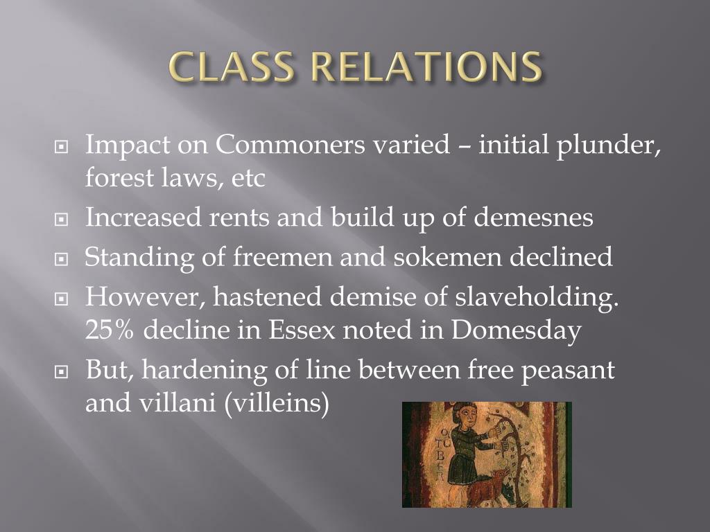CLASS RELATIONS • Impact on Commoners varied – initial plunder, forest laws, etc • Increased rents and build up of demesnes • Standing of freemen and sokemen declined • However, hastened demise of slaveholding. 25% decline in Essex noted in Domesday • But, hardening of line between free peasant and villani (villeins)