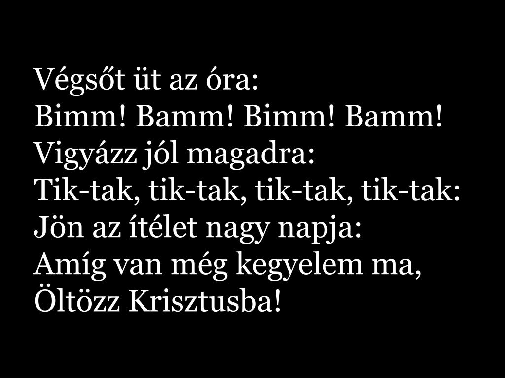 Végsőt üt az óra: Bimm! Bamm! Bimm! Bamm! Vigyázz jól magadra: Tik-tak, tik-tak, tik-tak, tik-tak: Jön az ítélet nagy napja: Amíg van még kegyelem ma, Öltözz Krisztusba!