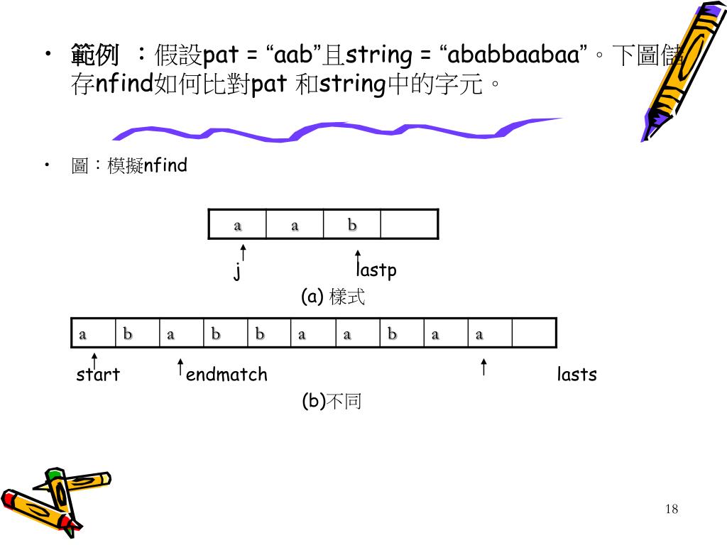 範例:假設pat = “aab”且string = “ababbaabaa”。下圖儲存nfind如何比對pat 和string中的字元。 • 圖:模擬nfind j lastp (a) 樣式 start endmatch lasts (b)不同