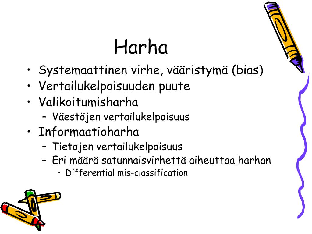 Harha • Systemaattinen virhe, vääristymä (bias) • Vertailukelpoisuuden puute • Valikoitumisharha • Väestöjen vertailukelpoisuus • Informaatioharha • Tietojen vertailukelpoisuus • Eri määrä satunnaisvirhettä aiheuttaa harhan • Differential mis-classification