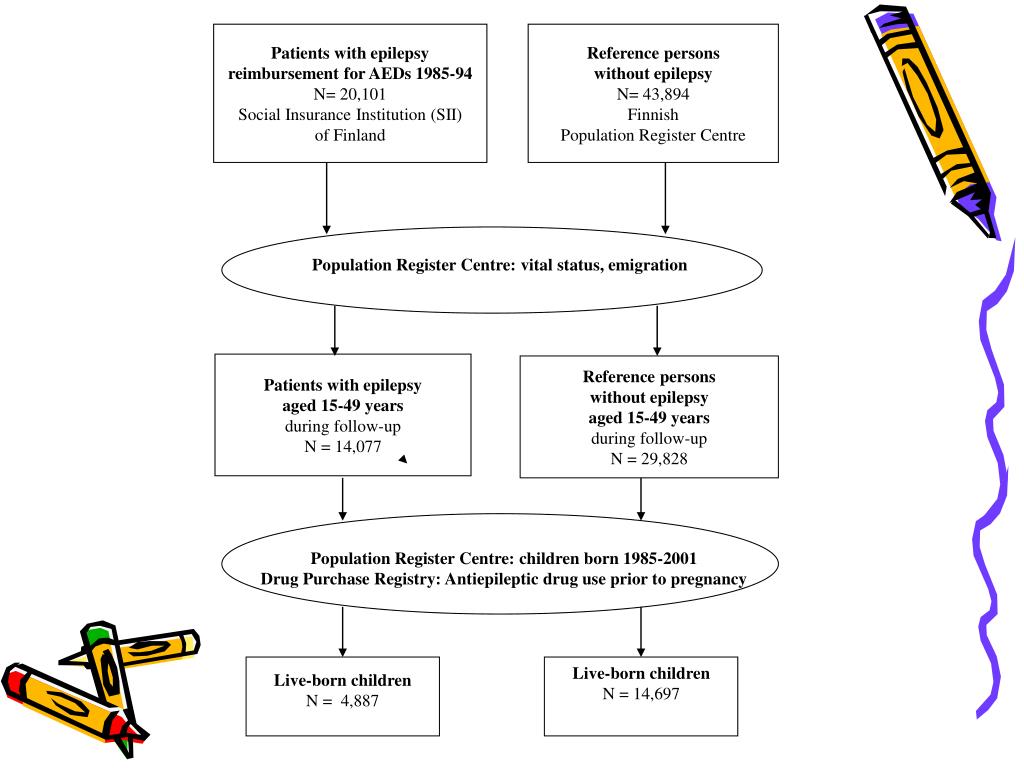 Patients with epilepsy reimbursement for AEDs 1985-94 N= 20,101 Social Insurance Institution (SII) of Finland Reference persons without epilepsy N= 43,894 Finnish Population Register Centre Population Register Centre: vital status, emigration Patients with epilepsy aged 15-49 years during follow-up N = 14,077 Reference persons without epilepsy aged 15-49 years during follow-up N = 29,828 Population Register Centre: children born 1985-2001 Drug Purchase Registry: Antiepileptic drug use prior to pregnancy Live-born children N = 14,697 Live-born children N = 4,887