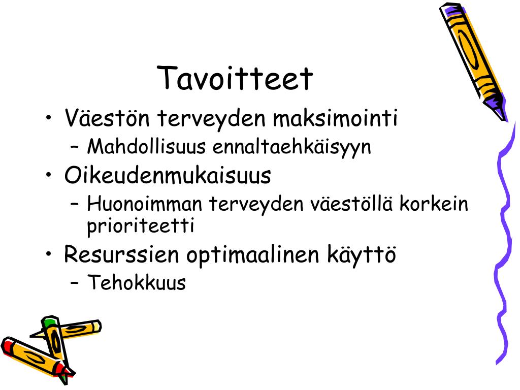 Tavoitteet • Väestön terveyden maksimointi • Mahdollisuus ennaltaehkäisyyn • Oikeudenmukaisuus • Huonoimman terveyden väestöllä korkein prioriteetti • Resurssien optimaalinen käyttö • Tehokkuus