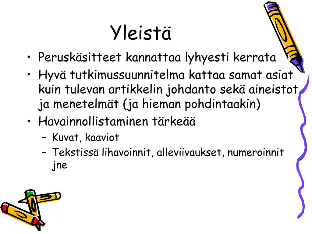 Yleistä • Peruskäsitteet kannattaa lyhyesti kerrata • Hyvä tutkimussuunnitelma kattaa samat asiat kuin tulevan artikkelin johdanto sekä aineistot ja menetelmät (ja hieman pohdintaakin) • Havainnollistaminen tärkeää • Kuvat, kaaviot • Tekstissä lihavoinnit, alleviivaukset, numeroinnit jne