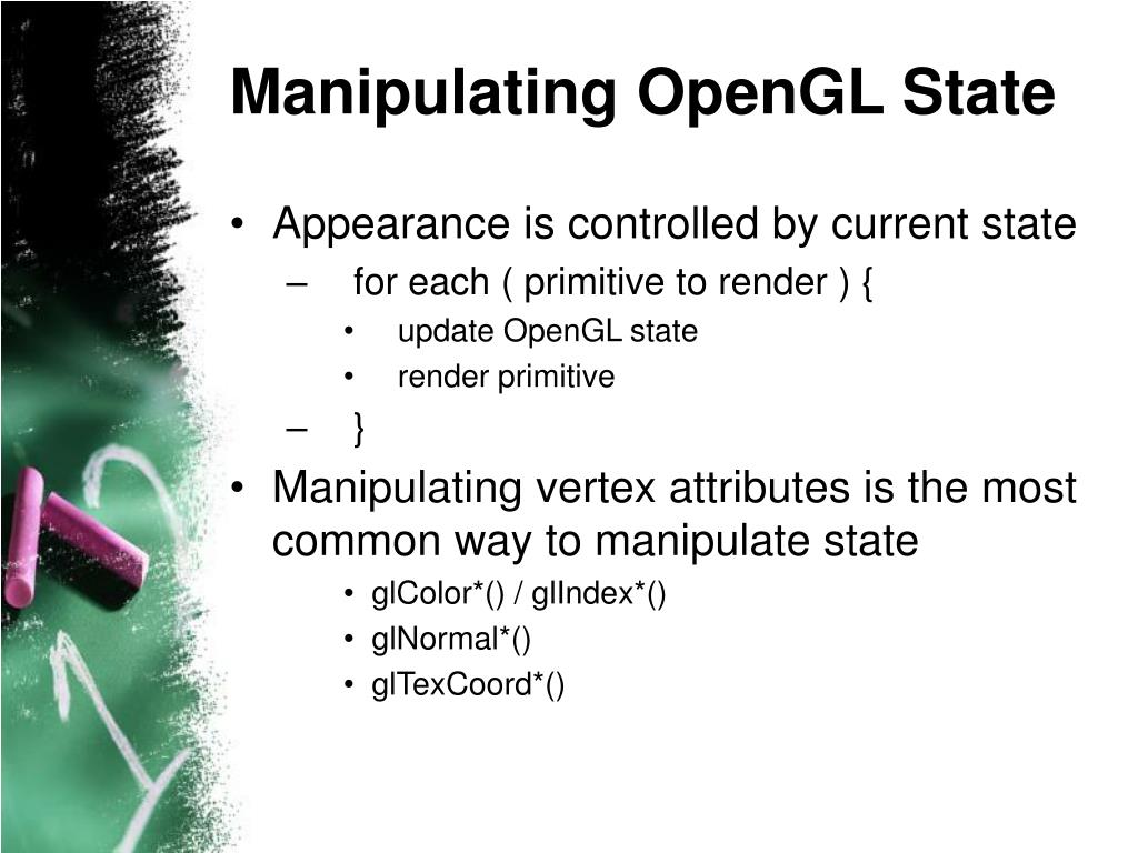 Manipulating OpenGL State • Appearance is controlled by current state • for each ( primitive to render ) { • update OpenGL state • render primitive • } • Manipulating vertex attributes is the mostcommon way to manipulate state • glColor*() / glIndex*() • glNormal*() • glTexCoord*()