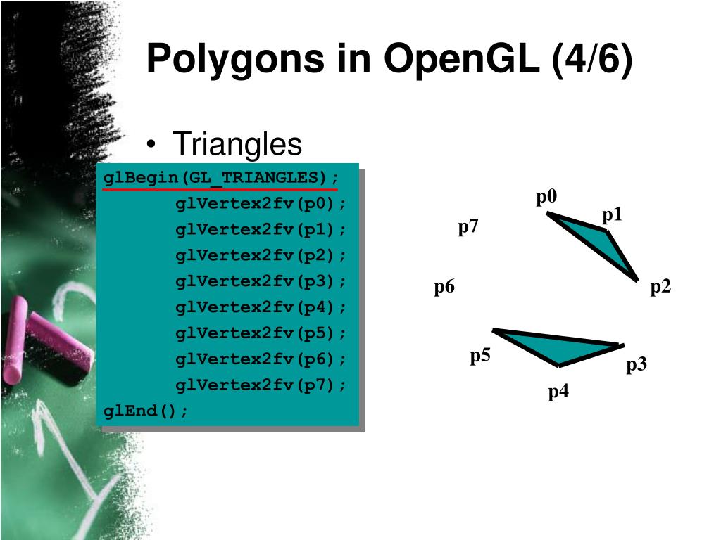 p0 p1 p7 p6 p2 p5 p3 p4 Polygons in OpenGL (4/6) • Triangles glBegin(GL_TRIANGLES); glVertex2fv(p0); glVertex2fv(p1); glVertex2fv(p2); glVertex2fv(p3); glVertex2fv(p4); glVertex2fv(p5); glVertex2fv(p6); glVertex2fv(p7); glEnd();
