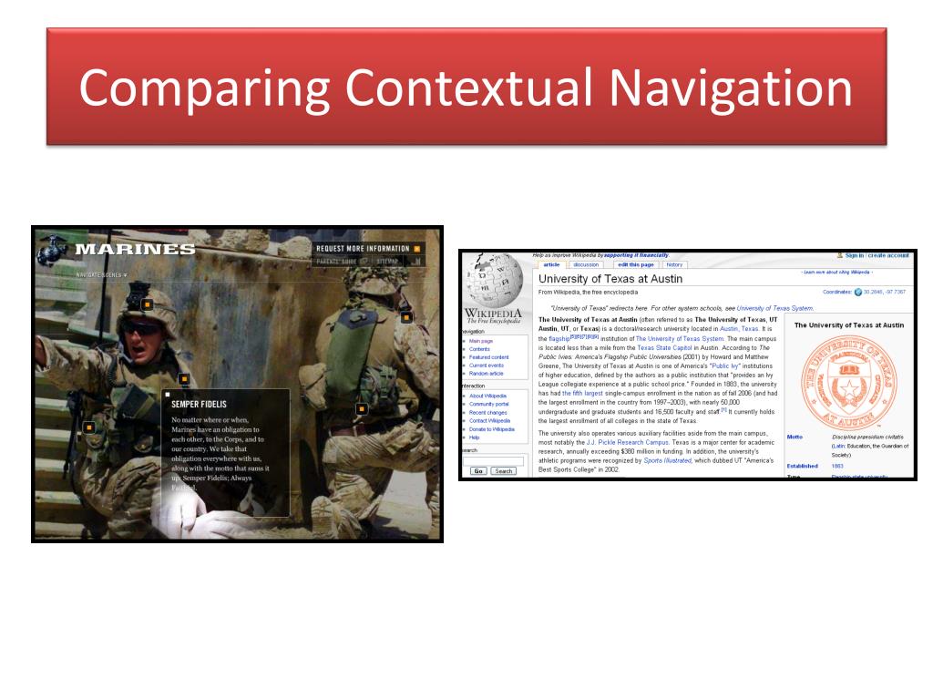 Contextual Navigation: Embedded Links • Hyperlinked text embedded in the content of a webpage. • This kind of navigation supports associative learning. • Links are not derived form hierarchal relationships.