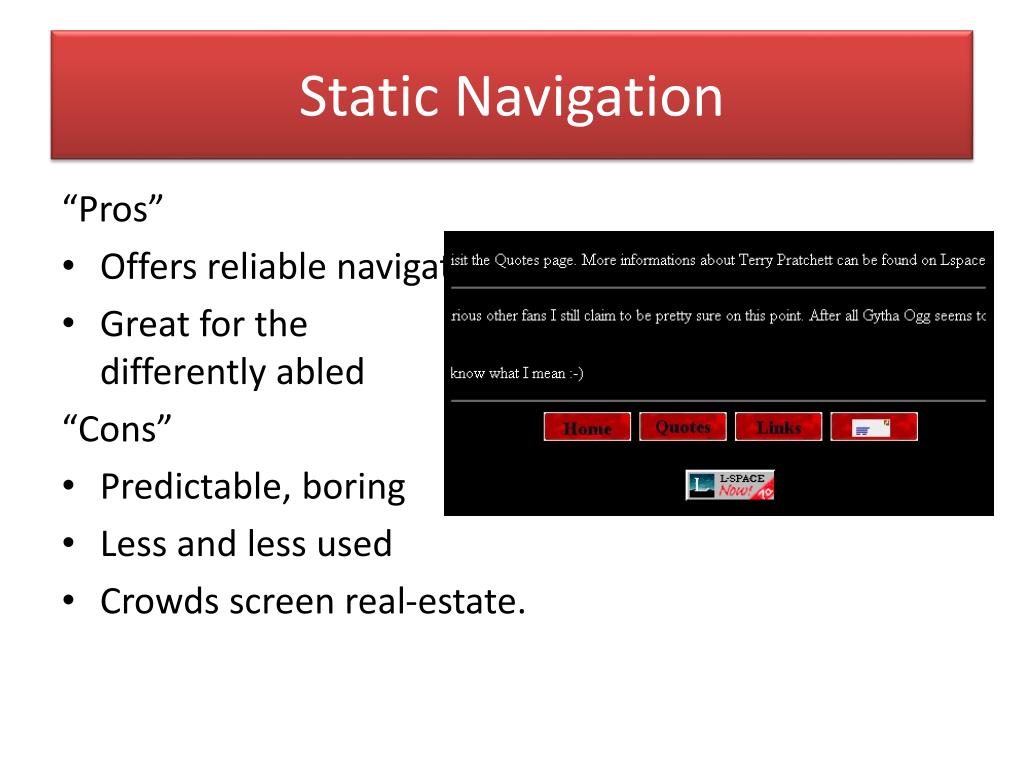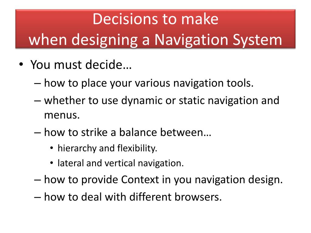 Decisions to make when designing a Navigation System • You must decide… • how to place your various navigation tools. • whether to use dynamic or static navigation and menus. • how to strike a balance between… • hierarchy and flexibility. • lateral and vertical navigation. • how to provide Context in you navigation design. • how to deal with different browsers.